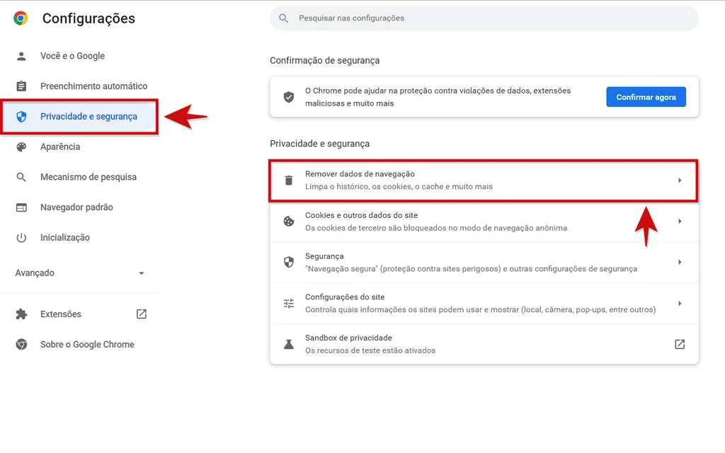 2. Na barra lateral, toque na opção “Privacidade e segurança” e, depois, escolha o comando “Remover dados de navegação”;