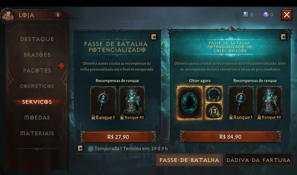Você pode comprar o Passe de Diablo Imortal dentro da loja do próprio jogo. O Passe de Batalha Potencializado custou R$ 27,90, enquanto o de colecionador vale R$ 84,90.